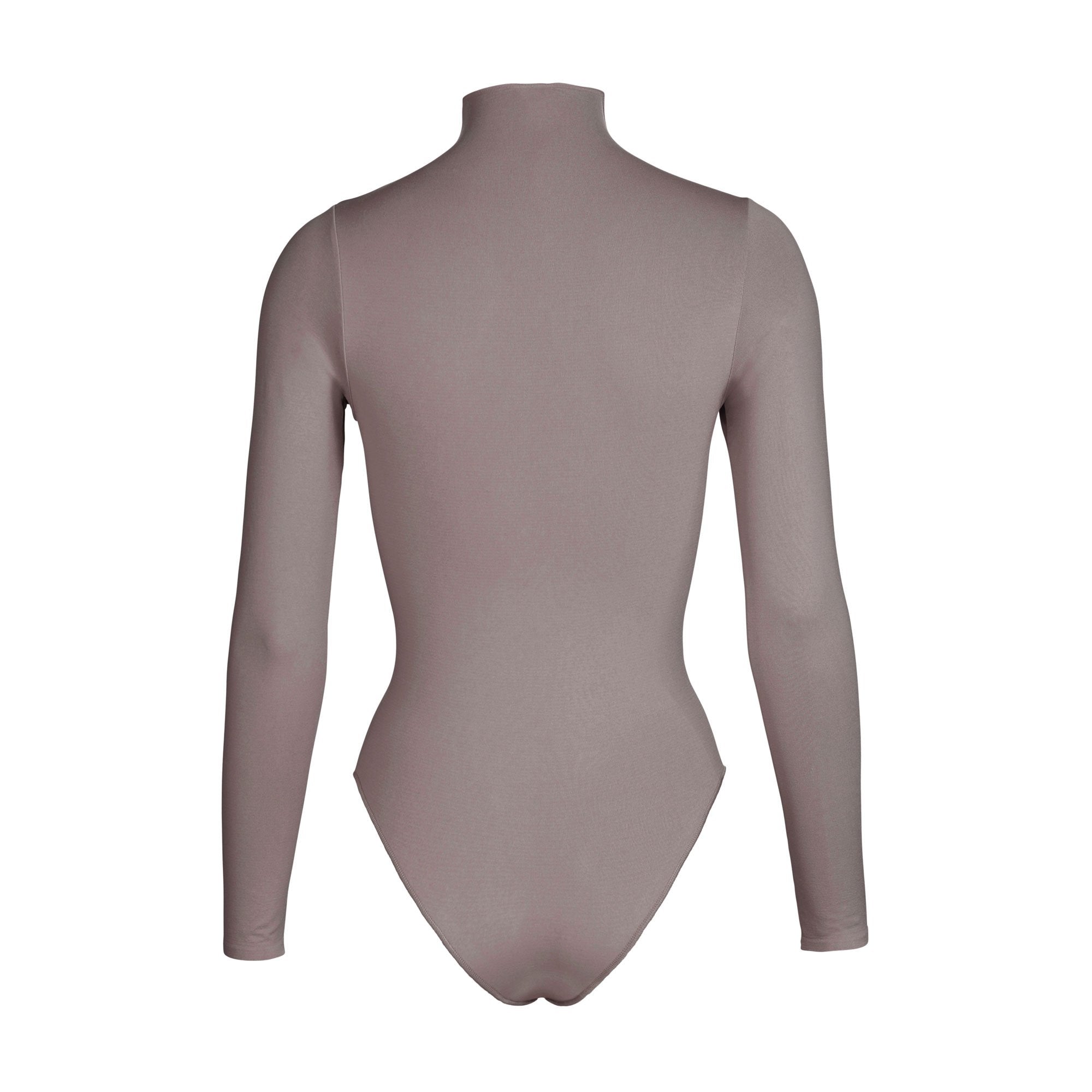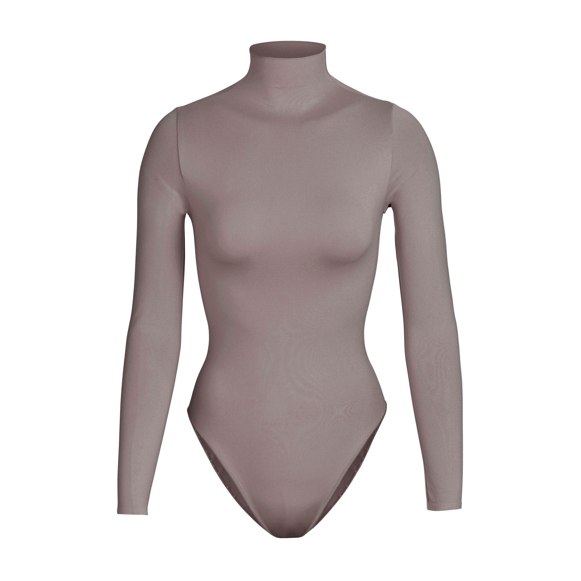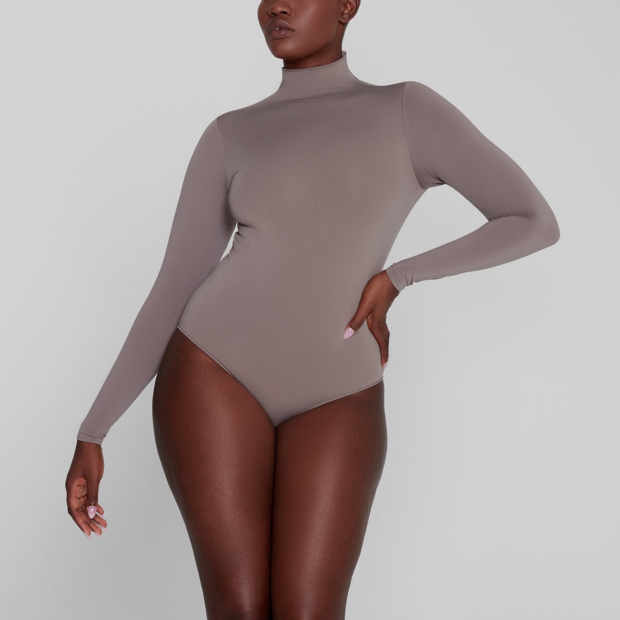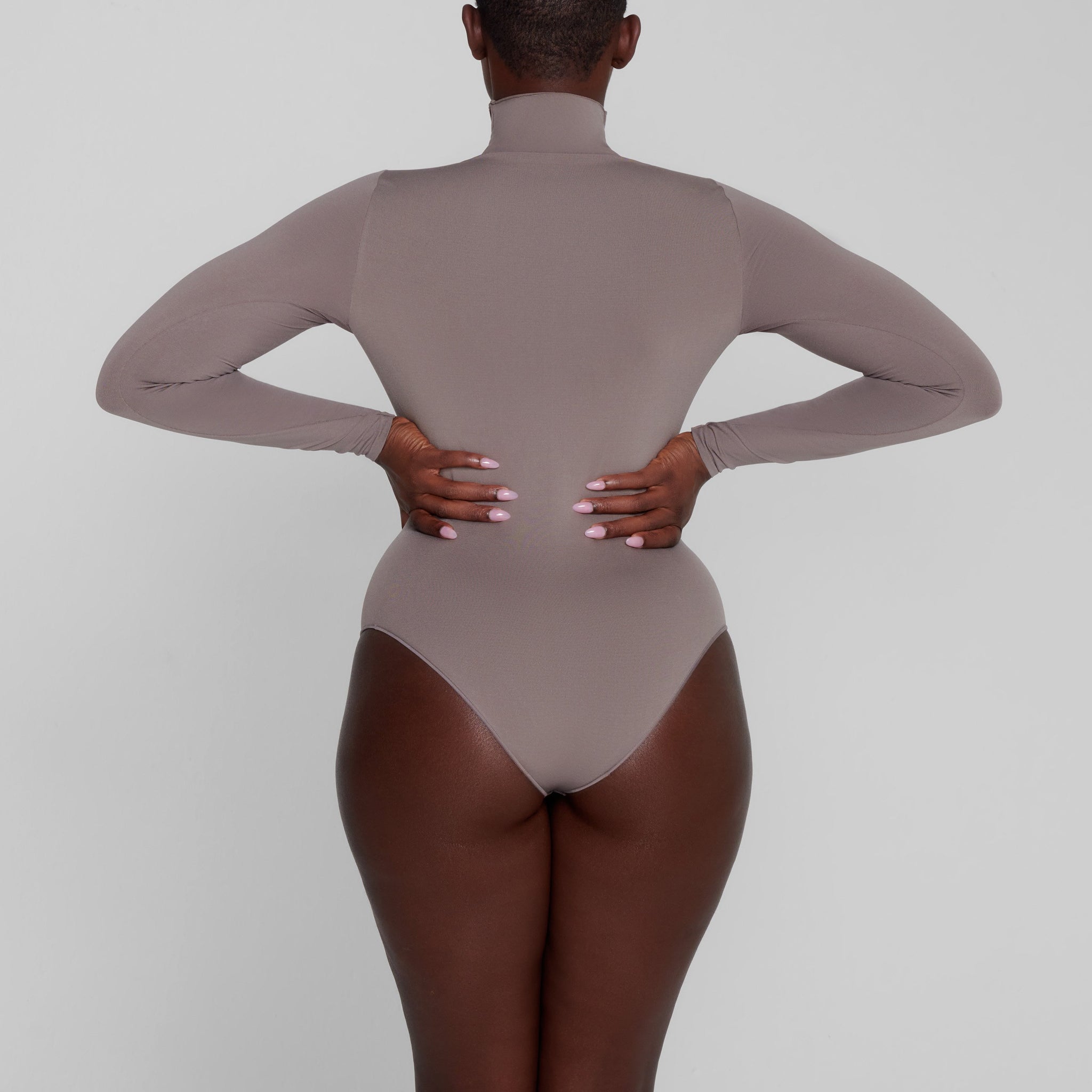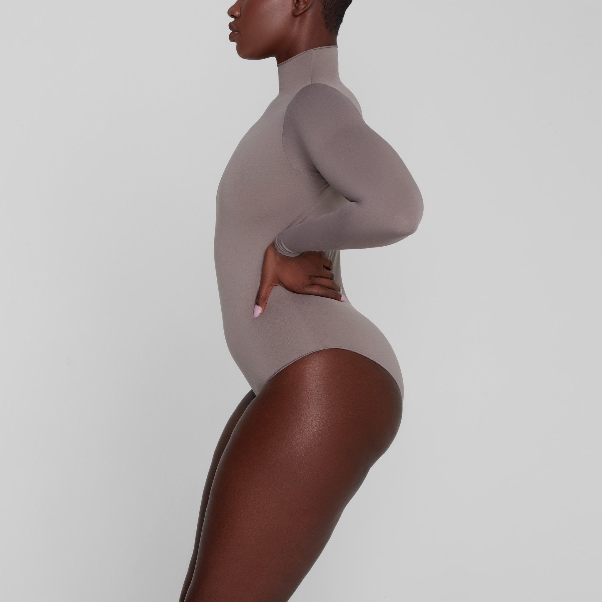 The Long Sleeve Mock Neck Bodysuit is a chic, comfortable wardrobe staple. Designed for ultimate comfort and support, this brief bodysuit features a raw cut neckline, snap closure at base, and satin stretch stitch at leg and arm openings.