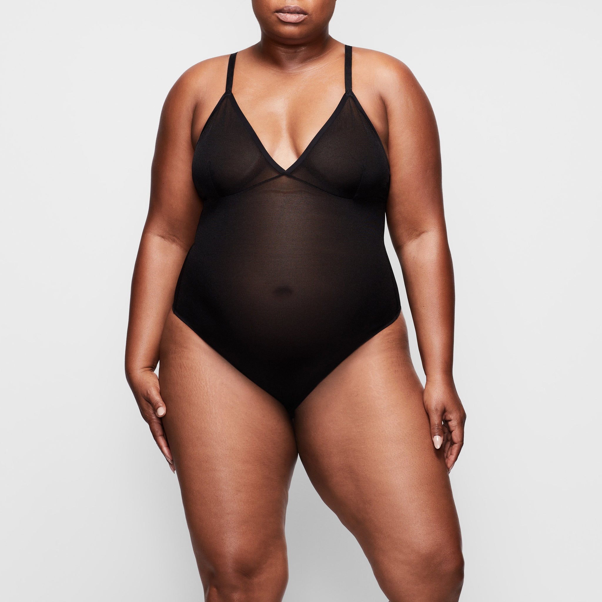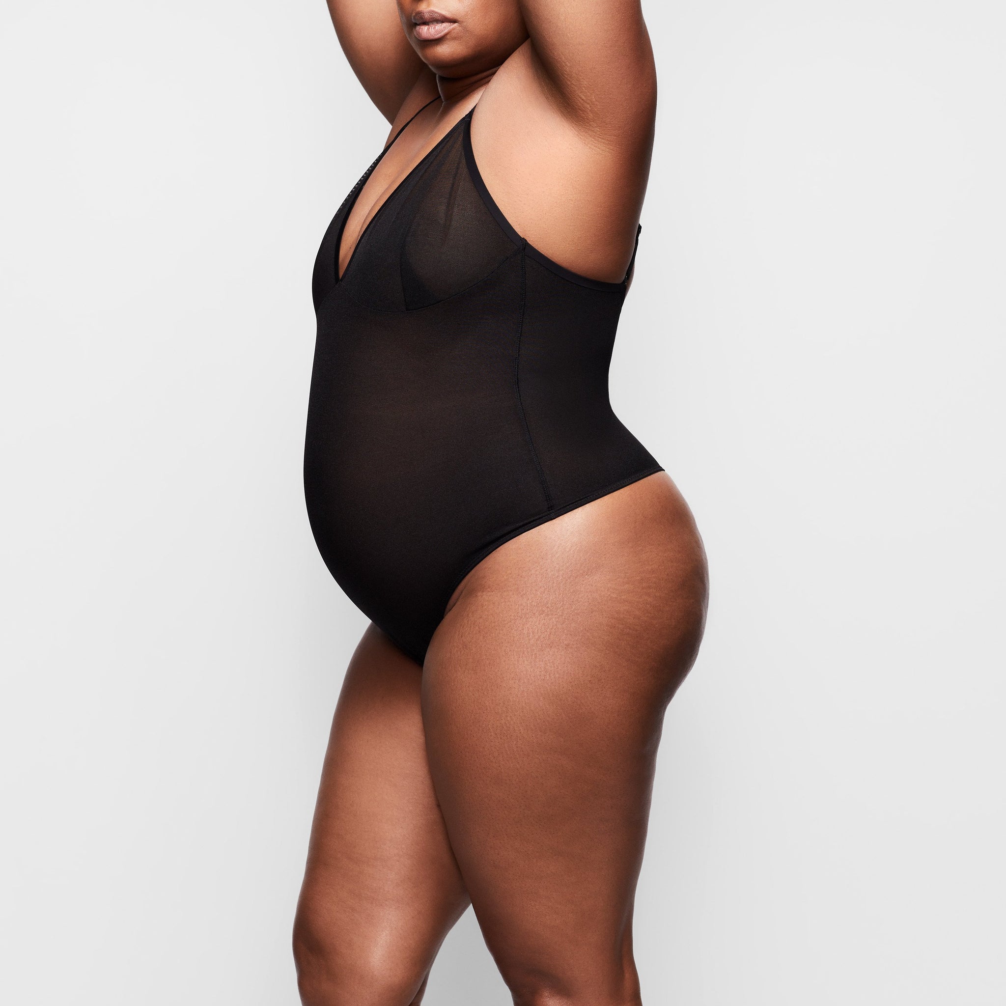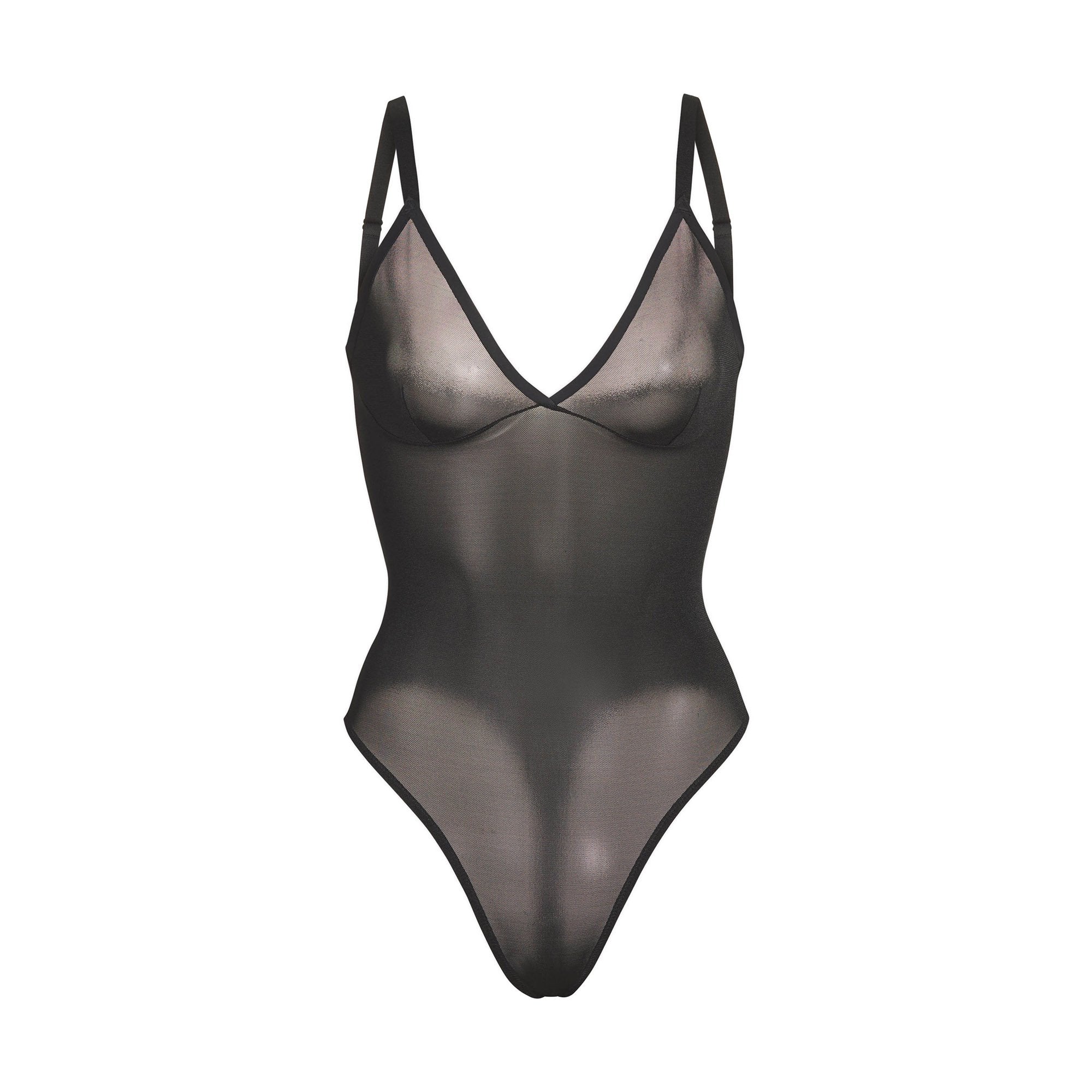 Invisible under everything, this sheer bodysuit holds in your core, supports your chest, and shapes your butt. Its silky smooth construction, deep v-neckline, and high-cut leg make this sheer bodysuit a sensual necessity for enhancing your body’s natural shape.