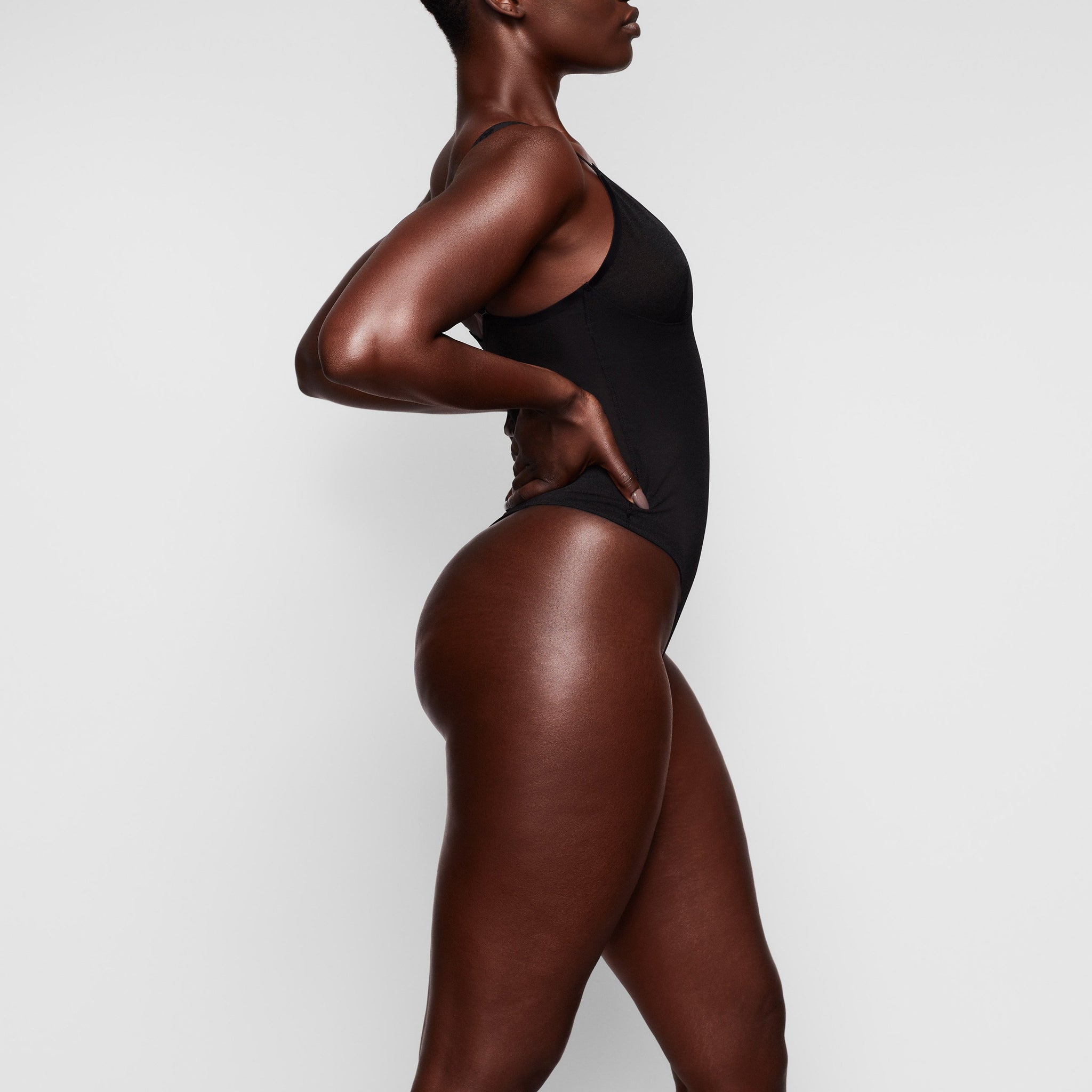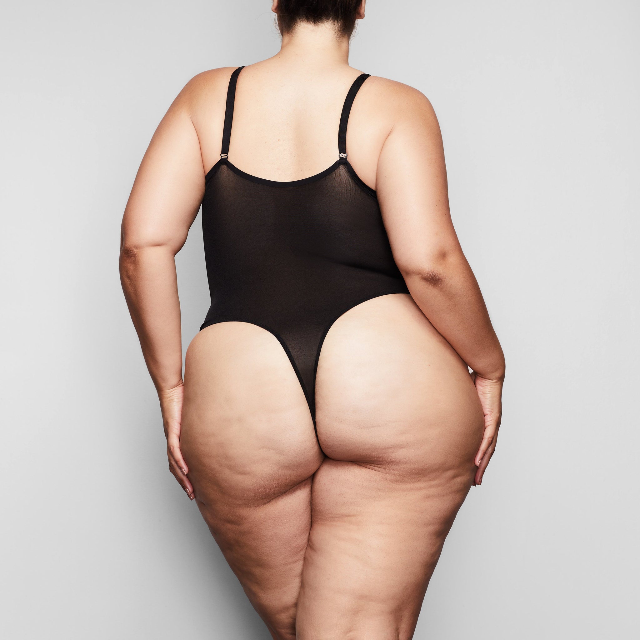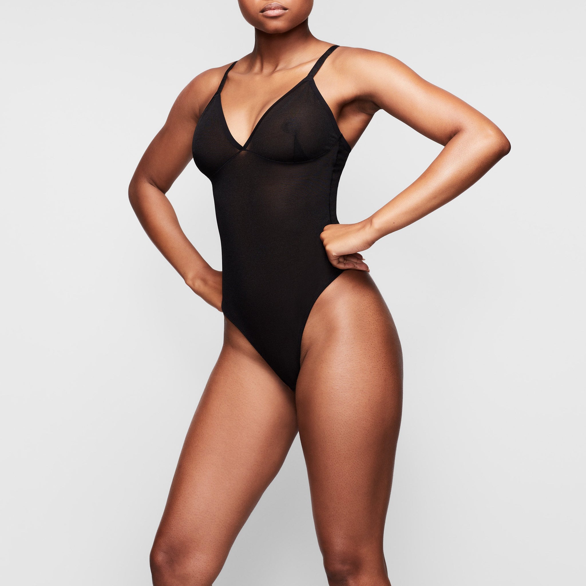 Invisible under everything, this sheer bodysuit holds in your core, supports your chest, and shapes your butt. Its silky smooth construction, deep v-neckline, and high-cut leg make this sheer bodysuit a sensual necessity for enhancing your body’s natural shape.